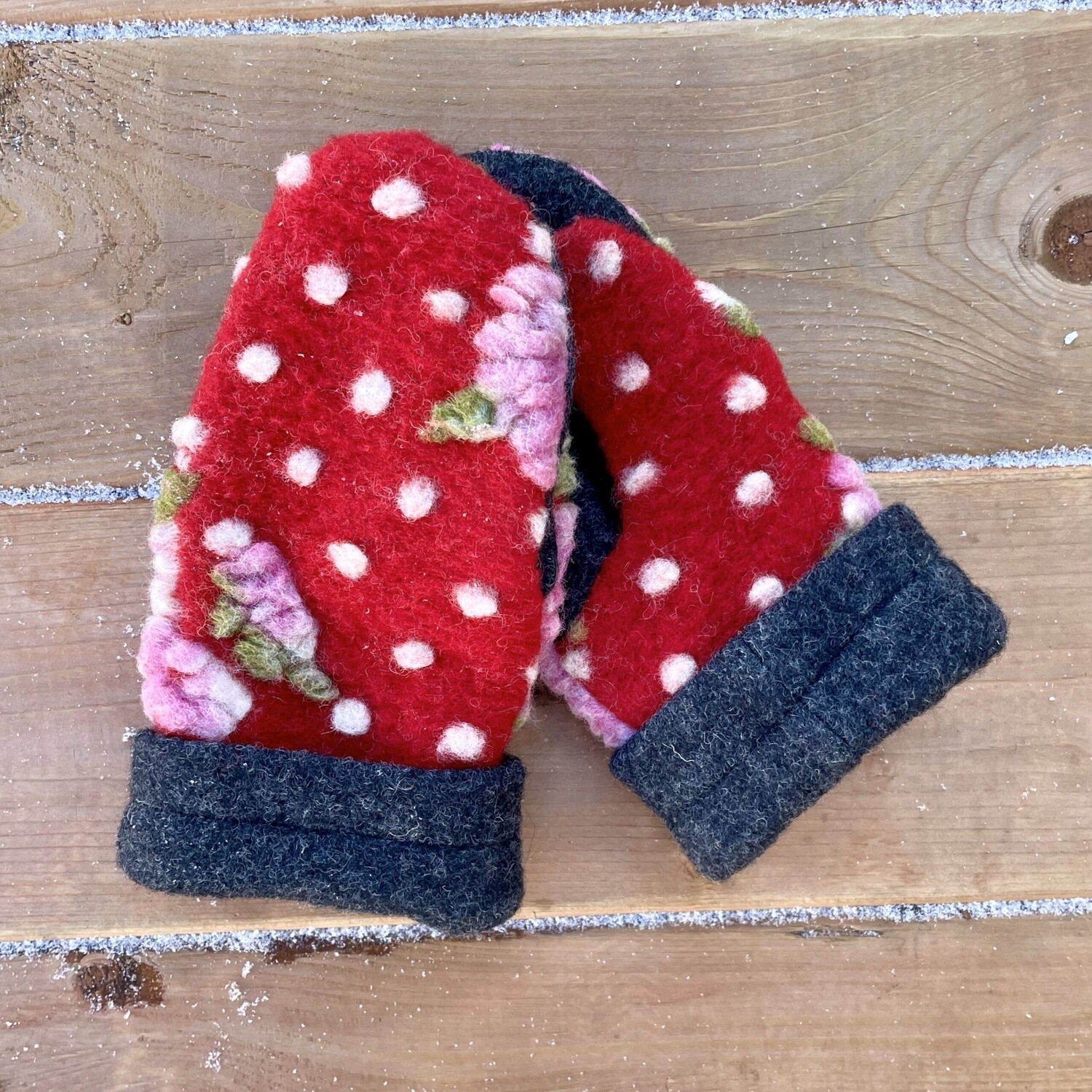 Dark red with pink roses // Cuff and inside of palm: Grey // lining: White